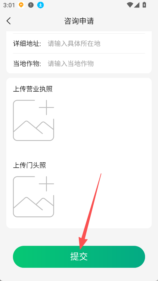 3、若咨询价格,填写详细地址、当地作物等信息,上传相关照片,点击“提交”。