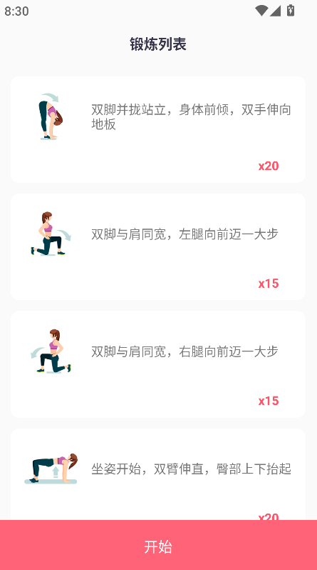 3、在锻炼列表页面中,可以详细浏览当天安排的所有训练项目名称、时长等详细信息。