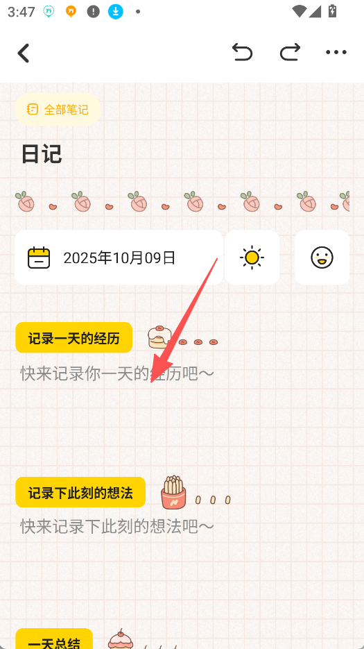 2、切换到日记板块,选择记录一天的经历或记录下此刻的想法,进行内容记录。