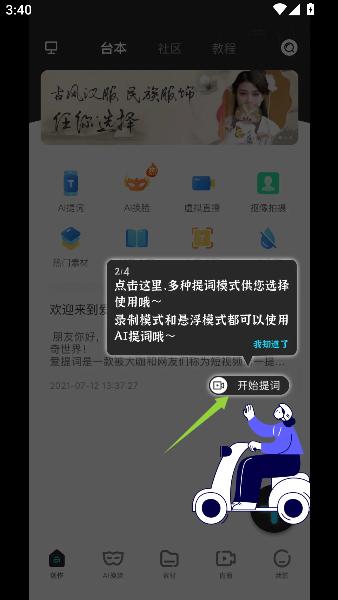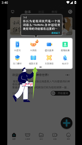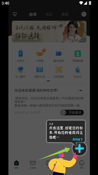 1、启动爱提词提词器应用后,界面会显示清晰的操作指引,通过点击提示按钮即可创建个人台词脚本,完成初步设置后进入主要功能界面。