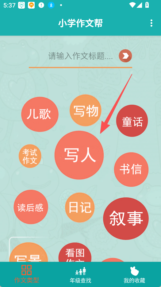 1、支持作文类型选择,打开软件后,可在儿歌、写物等多种作文类型中进行挑选。