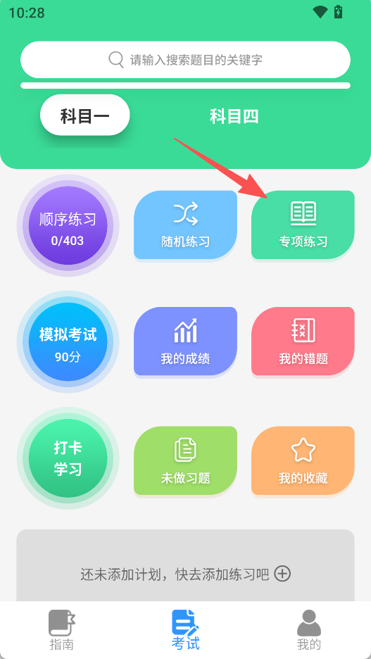 1、打开首页,进入考试页面,点击专项练习。