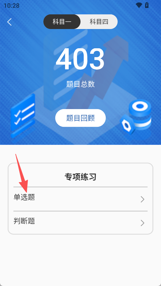 2、在专项练习页面,点击单选题,进入单选题练习界面。