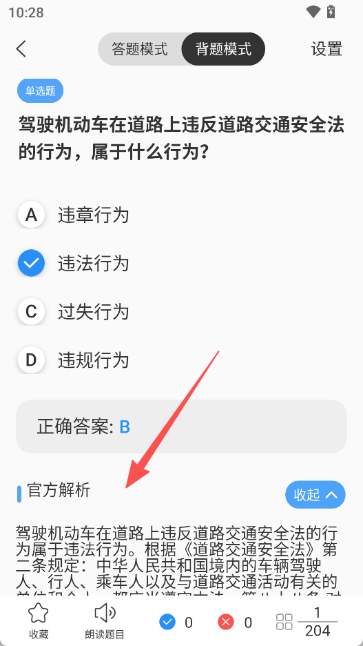 3、在答题界面,选择题目答案,点击展开官方解析,查看题目解析。
