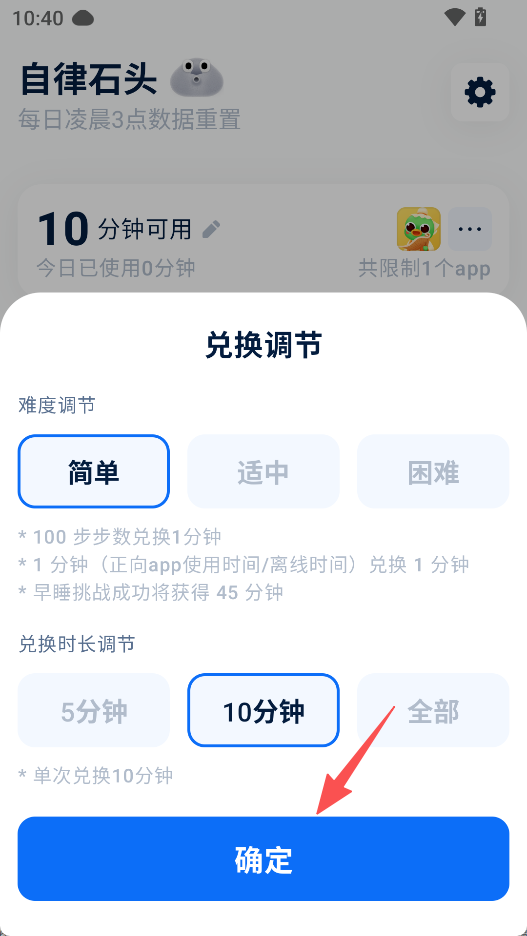 2、提供兑换参数调节,能选难度模式、设单次时长,点击确定后新规则即可生效,满足个性化设置。