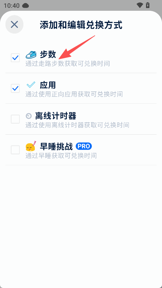 1、打开进入添加和编辑兑换方式,勾选步数、应用等兑换途径。
