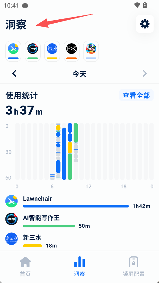 3、具备应用使用统计,洞察页面可查看当天及历史应用时长的图表与明细,清晰呈现时间分配。