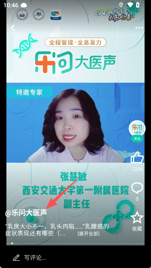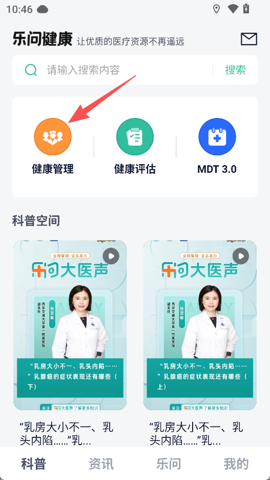 2、在科普空间,点击乐问大医声视频,观看健康科普内容。