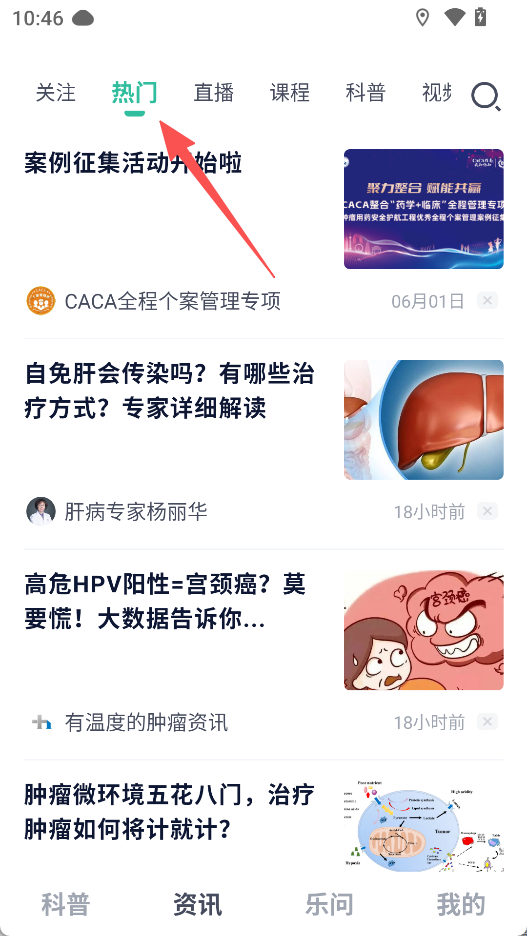 3、切换到资讯页面,点击热门,浏览健康相关热门资讯。