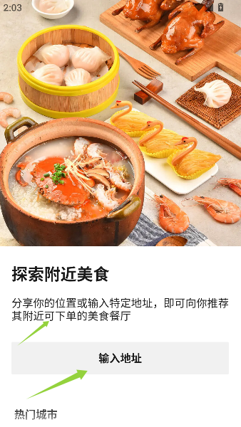1、在应用首页输入具体地址信息,系统会根据该位置自动推荐周边可提供配送服务的美食餐厅。
