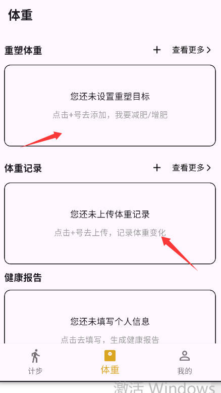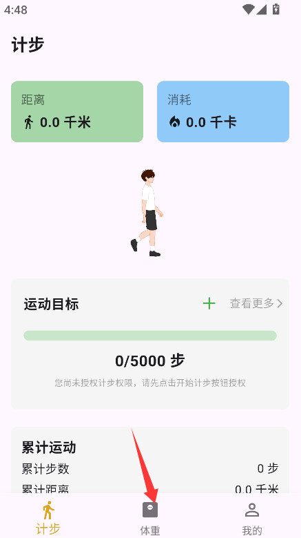 1、在计步功能页面底部定位并点击“体重”选项,即可跳转至体重管理主界面。