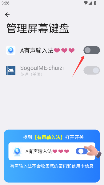 2、在输入法管理界面,定位到“有声输入法”的开关按钮,通过滑动或点击将其设置为开启状态。