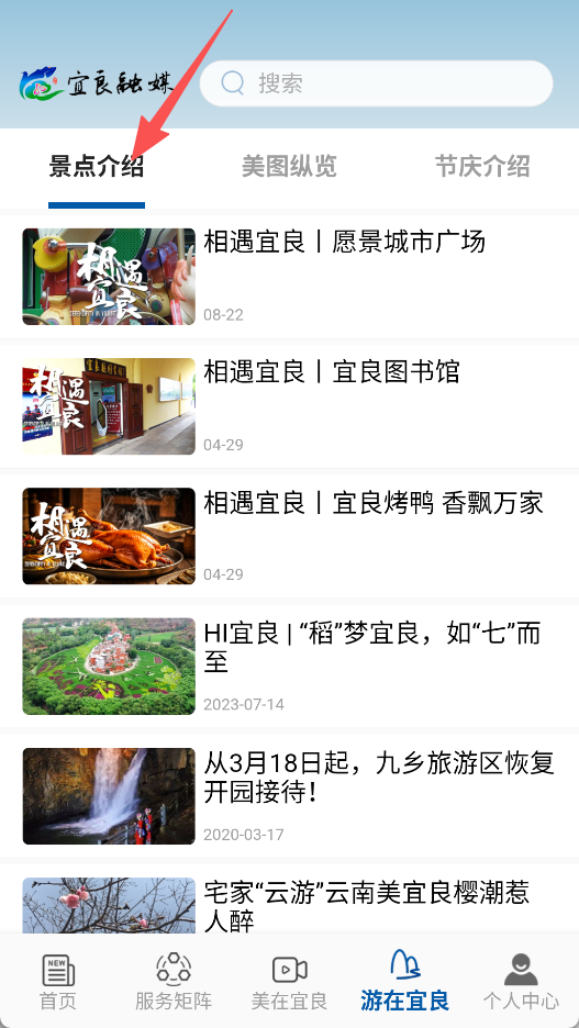 2、点击“游在宜良”,查看景点介绍、美图纵览等内容。