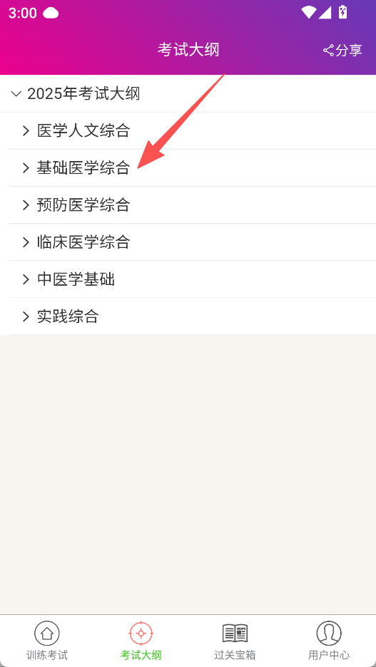 1、打开临床执业助理医师总题库,点击“考试大纲”。