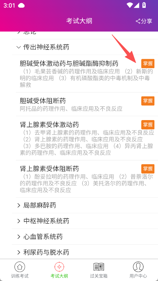 2、在考试大纲页面,选择学科,查看考点及掌握要求。