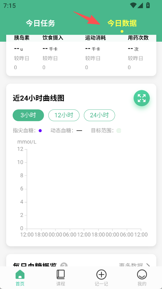 1、具备健康数据查看功能,在首页可查看今日胰岛素、饮食摄入等数据,以及近24小时血糖等指标曲线图。