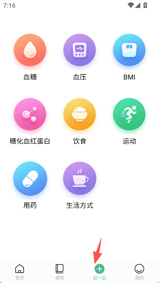 3、拥有健康信息记录功能,点击记一记,可记录血糖、血压、饮食、运动、用药等多类健康相关信息。
