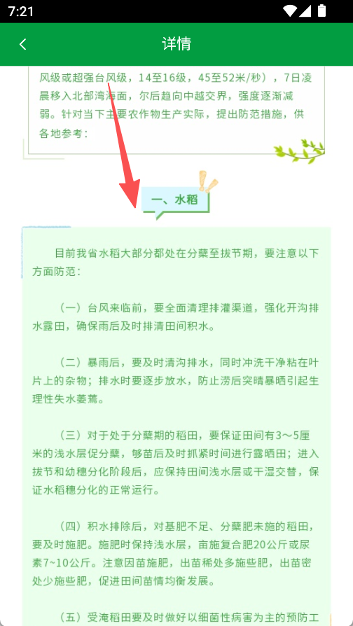 3、点击文章,进入详情页查看农作物防灾及管理指导。