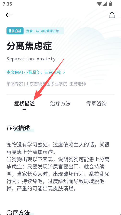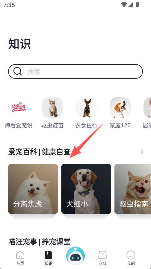 1、在知识页面,点击爱宠百科,健康自查中的主题(如分离焦虑)。