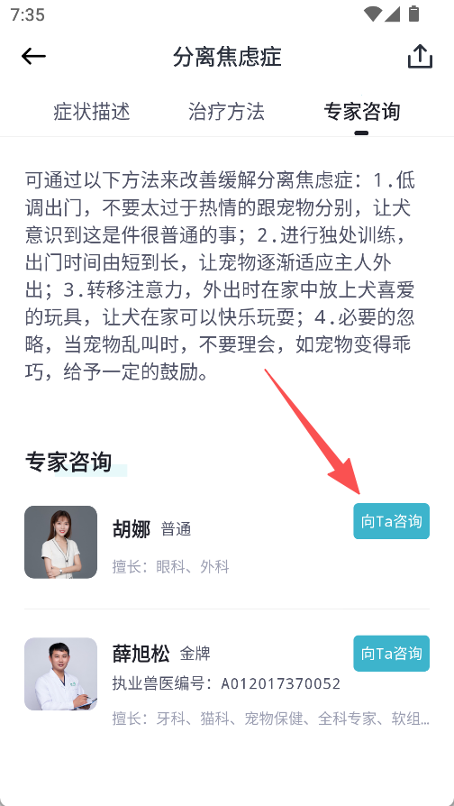 3、切换到专家咨询板块,点击对应专家的“向Ta咨询”按钮。