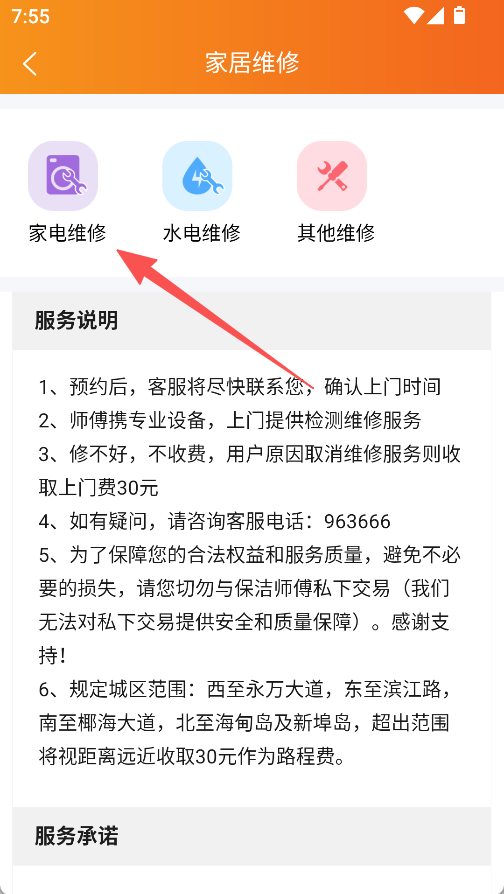 3、点击家居维修,选择家电维修等服务,还可查看服务说明。