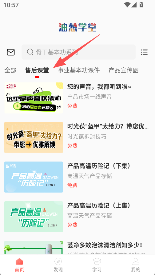 1、打开油葱学堂,在首页切换售后课堂等分类,查看对应课程。