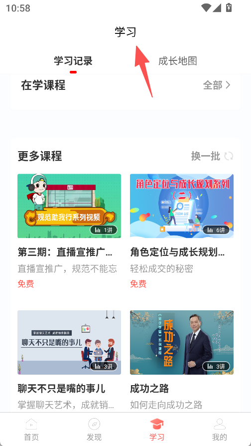 3、点击学习板块,查看学习记录、成长地图,选择更多课程学习。
