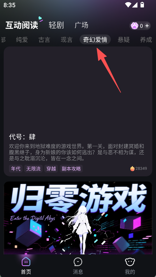 《玩剧乐园》是一款主打互动阅读与社交的文娱软件,首页设有互动阅读、轻剧、广场等板块,互动阅读涵盖纯爱、奇幻爱情、悬疑等多样题材,选择奇幻爱情类作品可查看详情阅读,广场板块能浏览用户发布的动态,还可参与点赞、评论互动,丰富的内容与互动形式,为用户带来沉浸式文娱体验。