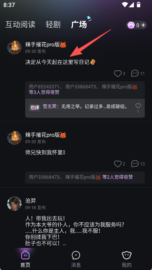 3、切换到广场板块,浏览用户动态,可参与点赞评论。