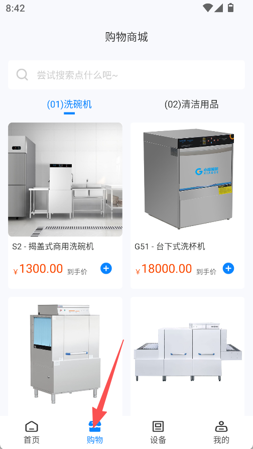 2、点击购物,进入商城选购洗碗机、清洁用品等厨房相关商品。