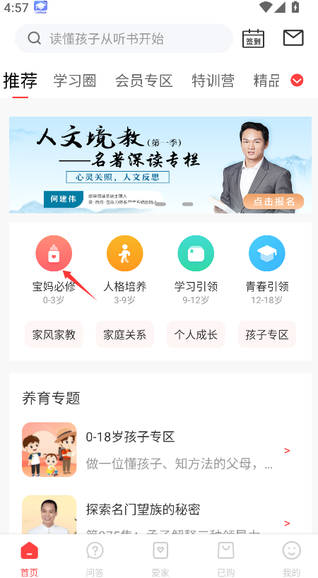 1、找到并点击“宝妈必修”入口,即可进入包含所有相关课程的列表页面进行浏览与选择。