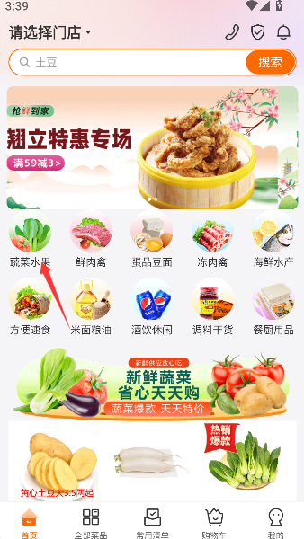 1、打开菜划算应用程序,在主页面上找到并点击蔬菜水果分类入口,进入该品类商品列表页。