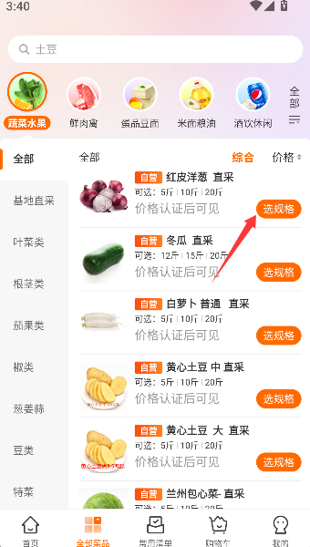 2、浏览蔬菜或水果商品列表,定位到需要采购的具体物品,点击其旁边的选规格按键进行操作。