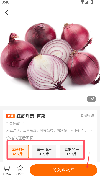 3、在弹窗中确定商品的具体重量或包装规格,点击加入购物车,即可统一进行结算支付。