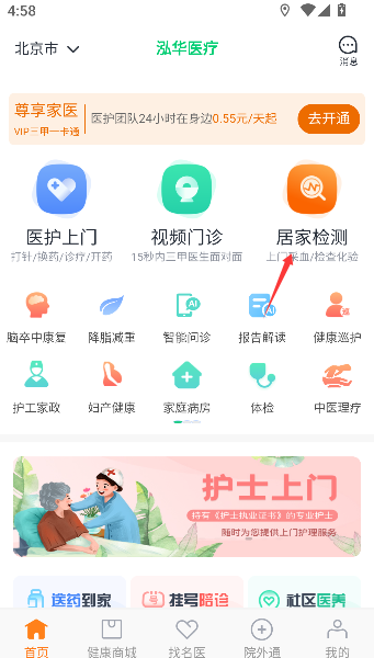 1、打开泓华医疗软件,在首页或服务页面中找到并点击“居家检测”功能入口,进入服务主界面。