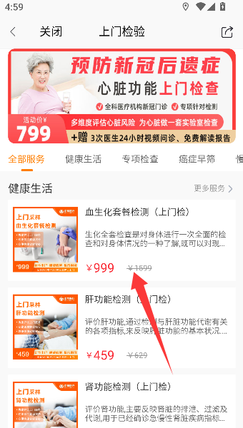 2、在检测项目列表中,可通过分类浏览或直接搜索查找所需的特定检测项目,如血常规或基因检测。