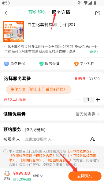 3、仔细阅读所选项目的详细说明、采样方法与注意事项,确认后点击立即支付即可成功预约上门服务。