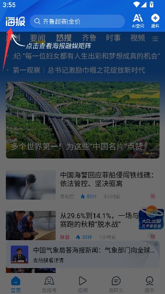 1、在首页点击“海报”频道,即可浏览由报社融媒体矩阵发布的各类图文及视频资讯内容。
