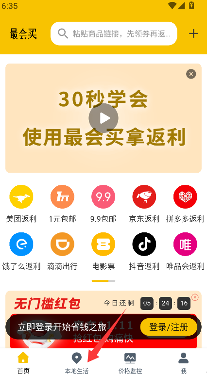 1、在首页底部导航栏中找到并点击“本地生活”选项,页面将切换至包含各类线下消费服务的本地生活频道。