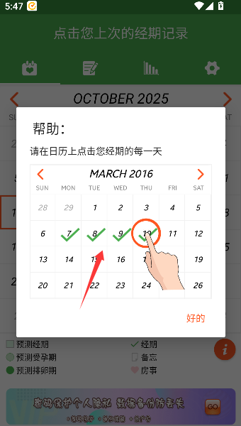 2、通过直接点击日历界面中的日期格子,可快速标记经期的开始日、结束日及持续期间的具体日期。
