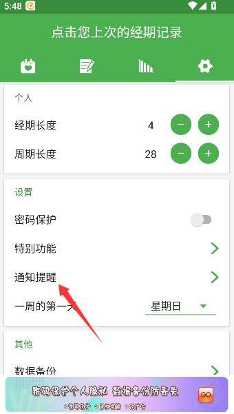 3、在设置选项中输入平均经期长度和月经周期数值,开启提醒功能即可接收经期预测通知。
