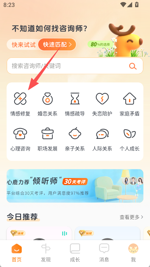 1、进入心鹿首页,点击情感修复类图标,进入咨询师列表页面。