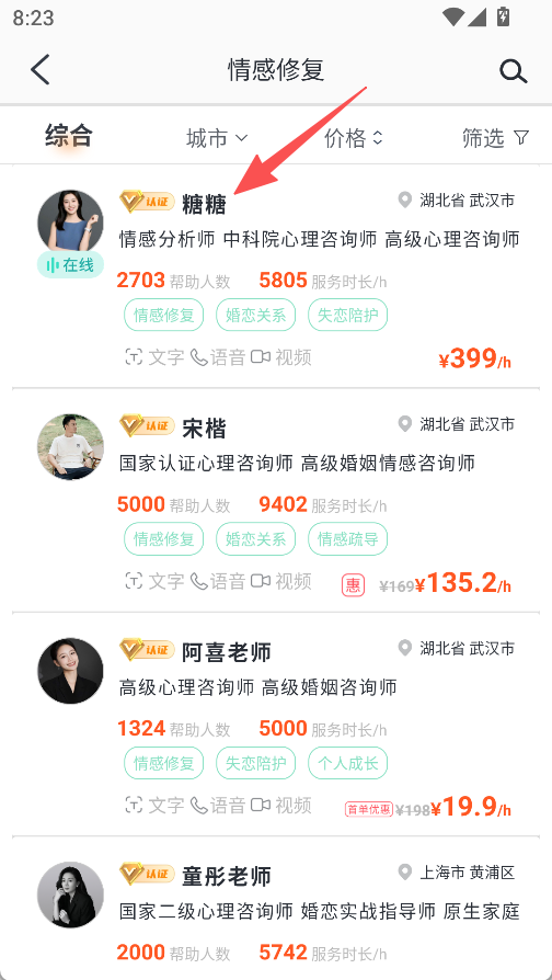 2、在列表中选择咨询师,查看其资质、帮助人数及服务时长等信息。