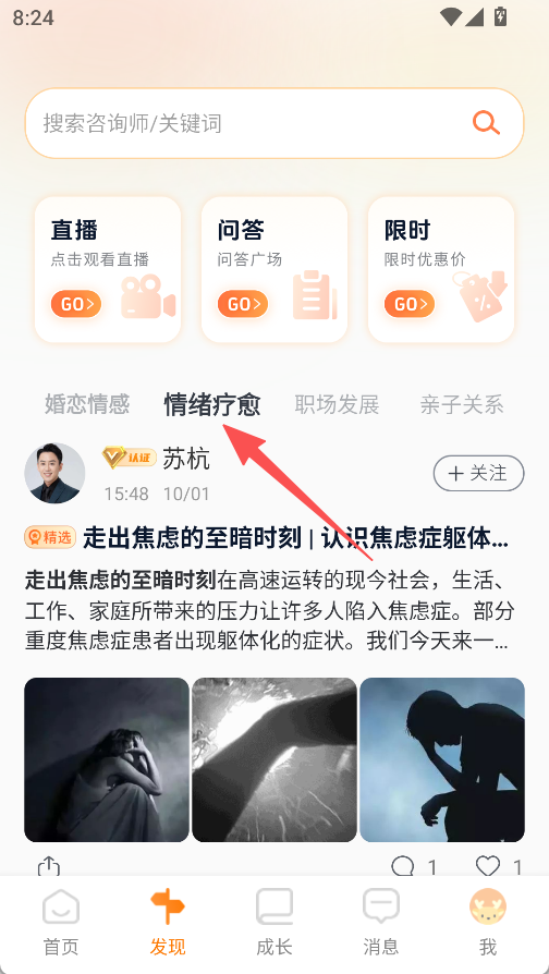 3、板块功能丰富,除咨询服务外,还有包含直播、问答、情绪疗愈等内容的发现板块,多维度给予心理支持。