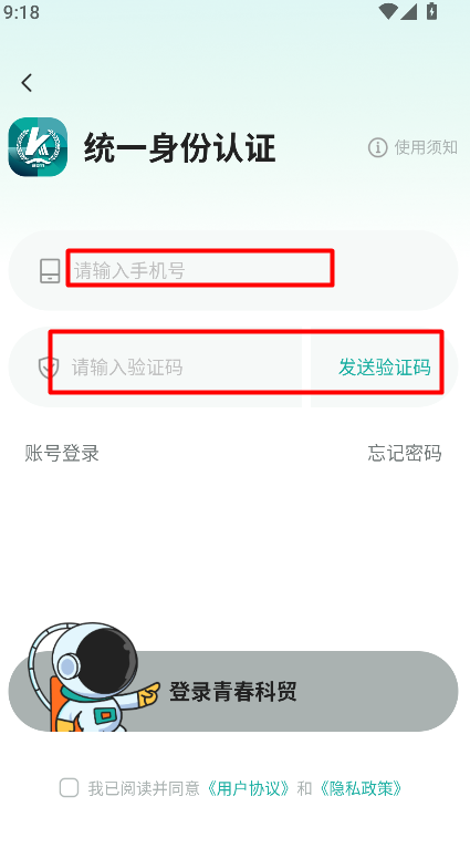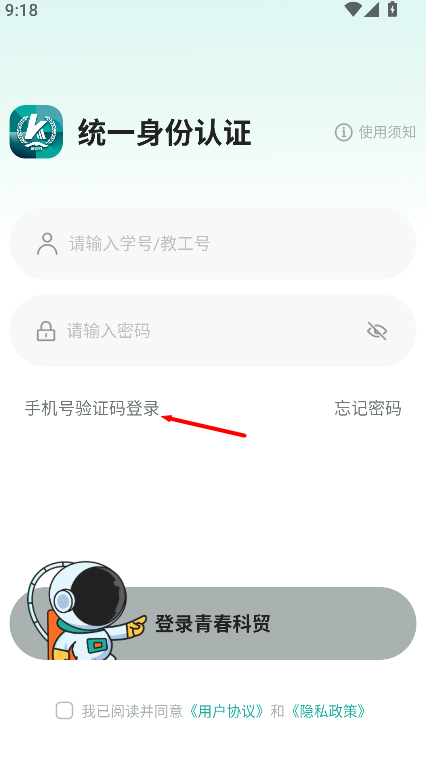 1、打开《青春科贸》app后,在登录界面可先阅读使用须知,了解账号使用规则、隐私政策及操作说明,确保登录过程安全规范。