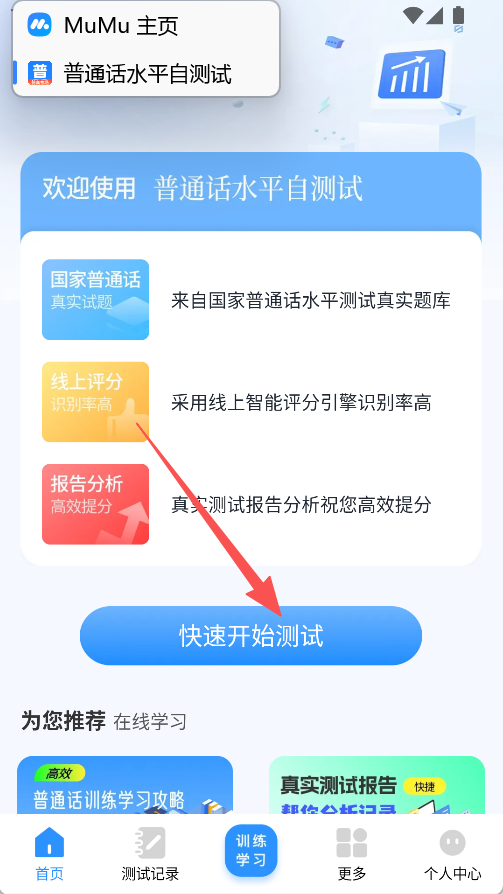 1、具备测试功能,用户可快速开始测试,抽取试卷后完成读单音节词等环节的朗读测试。