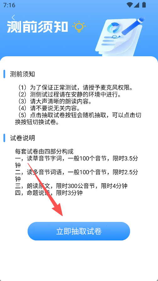 2、阅读须知后,点击立即抽取试卷。
