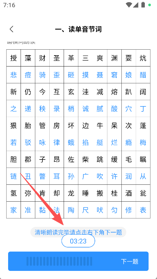 3、完成读单音节词等环节,清晰朗读后点击下一题。