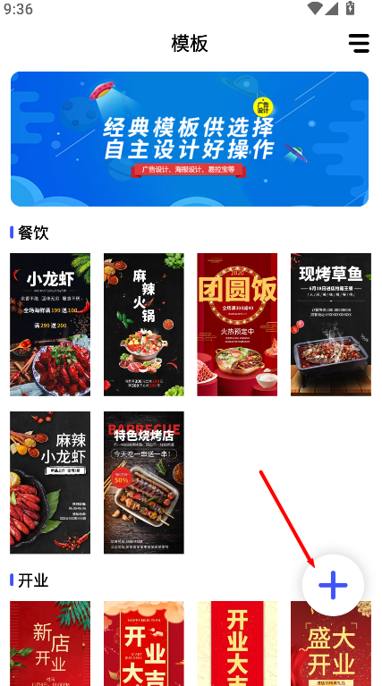 1、打开《广告设计》app后,进入首页界面,点击页面下方的“+”号按钮,即可创建新的设计项目,进入编辑操作界面。