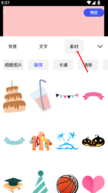 4、完成文字排版后,可进入素材预览区域,浏览图形、图标、装饰元素等素材内容,挑选合适元素进行搭配完善设计效果。